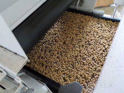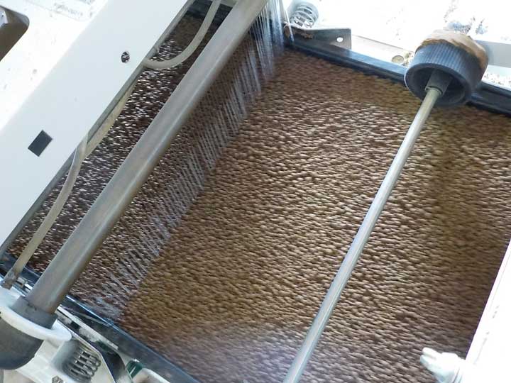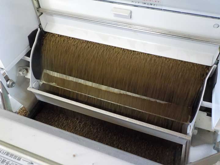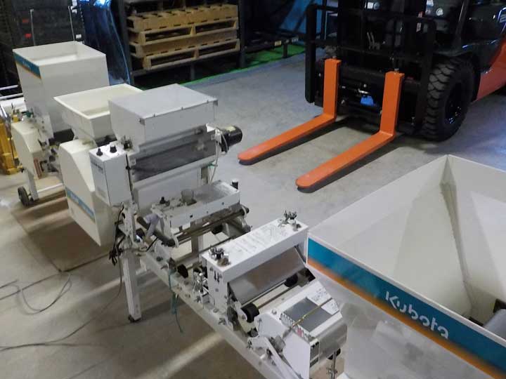 ベルトコンベアのような機械に育苗箱を載せ、底面から順に床土、水、種子、覆土の順に箱に詰めていきます。