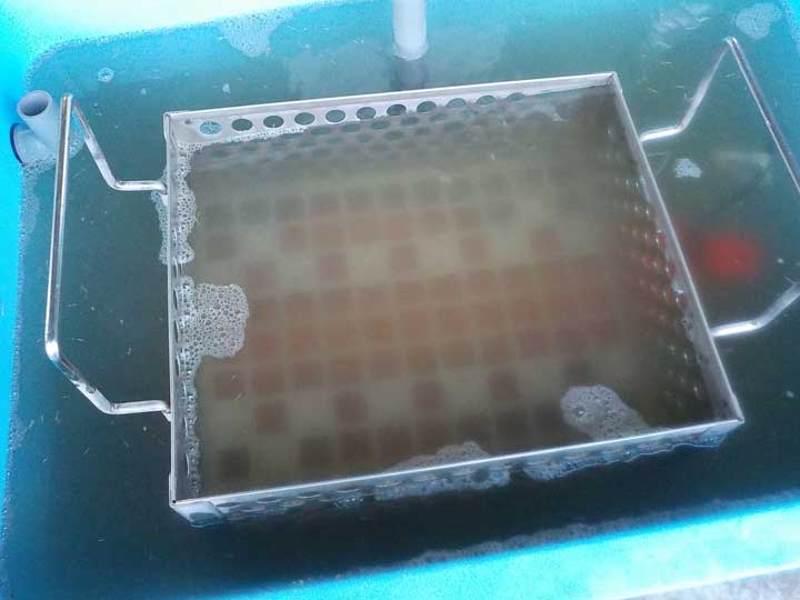 お湯に沈めるために、カゴの下に押し込んで無理やりやってみました。