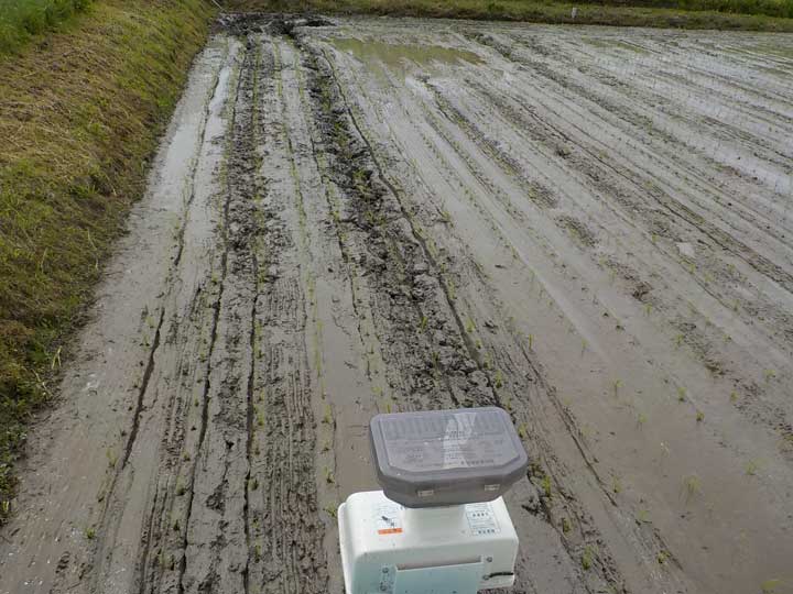 自宅近辺に戻ってきて次は「タンチョウモチ」の田植え。これは無農薬栽培なので、田植え機の後ろについている除草剤を散布する機械を空にしての田植えです。空っぽにしておけば誤って電源が入っていて散布してしまったということにはなりません。