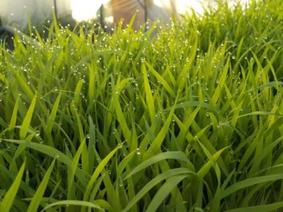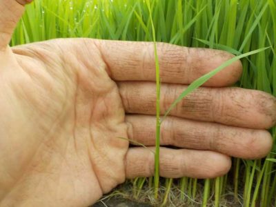 葉の頭についている水滴は露ではなく、葉から出てきた水です。根から吸い上げた水が呼吸をするときに葉から出てきたもので、溢液(いつえき)と言います。稲の体全体が健全な証拠です。この現象は苗の時だけではなく、田んぼに植えて大きくなってからもずっと現れます。