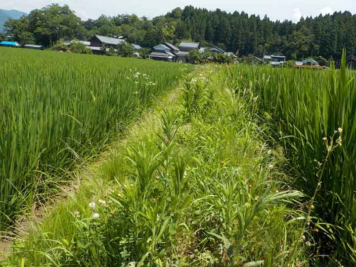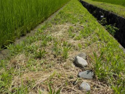 この時期の主な仕事は田んぼのあぜ道の草刈りです。土質によって雑草の種類や伸び方が違います。