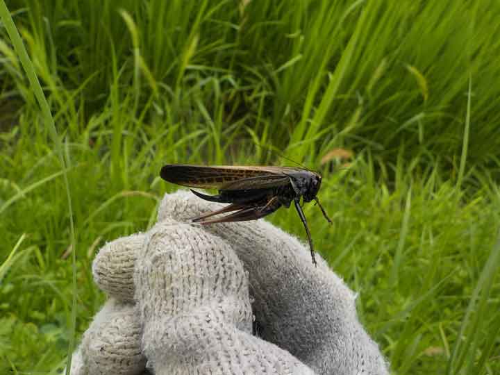 黒いバッタを見かけました。キリギリスの仲間で「ヒメギス」というらしいです。普通は羽が短いみたいですが、こいつは羽の長い珍しい種です。