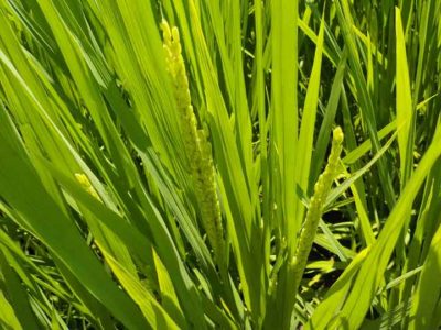 4月末に植えたハナエチゼンと夢あおばの穂が出てきました。6月が寒かったので心配していたのですが、昨年とは1週間遅れの出穂開始です。コシヒカリの出穂は8月のお盆前後になるでしょうか。