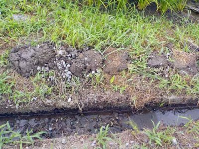 大雨が降ると用水路が詰まって田んぼに水が入ってしまうことがありあります。泥や砂利などを含んだ大量の水が田んぼに入ると、稲を押し倒してしまう場合があり、あとちょっとで収穫という稲がこのようなことになると、残念というよりは悲しくなってしまいます。