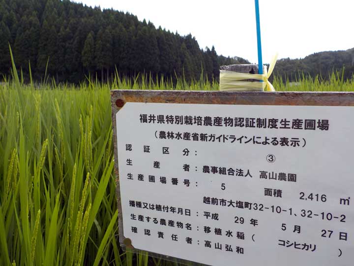 高山農園で一番最初に植えたコシヒカリです。5月末に植えたものがようやく穂が出始めました。これからという時なので、台風でダメにならないことを祈るばかりです。