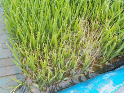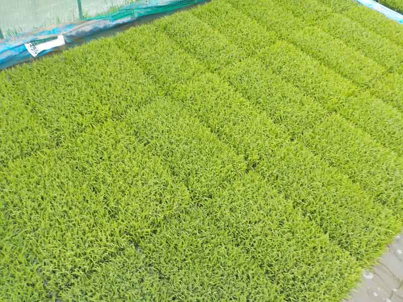 一番最初に種をまいたハナエチゼンの苗。地上部分はだいぶんフサフサしています。プール育苗だと水分や温度のムラがほとんど無いので見た目はきれいな苗になります。