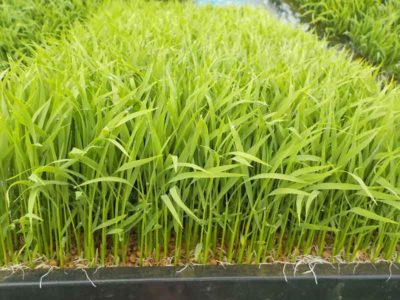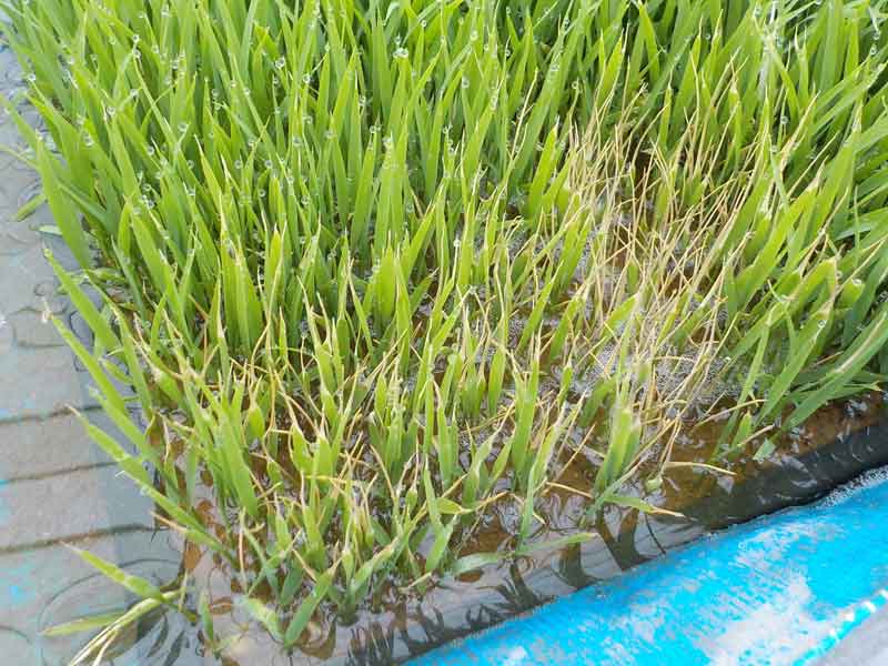 苗の一部が寒さに当たって地上部が完全にクリーム色に委縮してしまったものですが、根は大丈夫だったみたいでプールに漬けておいたらだんだんと元通りに回復してきました。イネ科の植物は根元がしっかりしていれば生長することが出来るのが強みです。