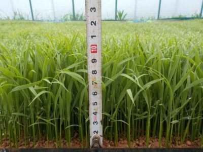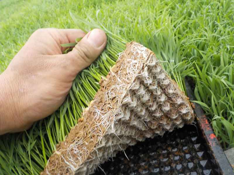 だいたい2.5葉目ぐらいでしょうか。背丈は10cm。この品種はなかなか背丈が伸びないにもかかわらず早生品種なので、毎年田植ができるくらいまで背を伸ばすのに苦労します。根が苗箱に入りきらずとびだしてきました。プール育苗だとこんなことが起きます。