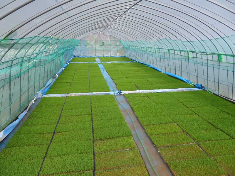 一番最初に種をまいたハナエチゼンの苗の緑化が完了したので、今後はプールに水を張って管理していきます。