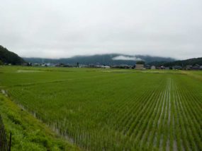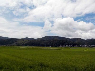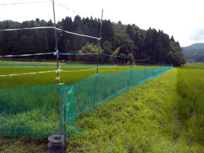 山際の田んぼはイノシシとシカ対策ですごいことになっていますが、これぐらいやらないと安心できません。これから収穫期にかけてイノシシが餌を探しに山から下りてくるので、稲穂も狙われるようになります。その対策のため、近くに大きな川や山がある田んぼは全部電気柵で囲って対策をします。田舎ならではの面倒な作業です。