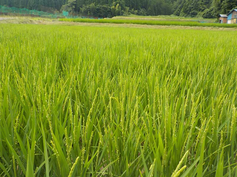 ハナエチゼンも穂が出始めました。長雨の影響で涼しい日が続いたので例年に比べると少し遅いかな?という感じです。陽の光が無いとお米が十分に実らないので、これから収穫までにどれだけ晴れるかがポイントです。