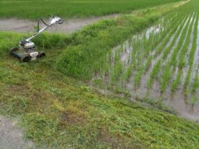 田植えから稲刈りまでの期間は、ほぼ毎日田んぼの周囲の草刈り。農家の作業のうち、作業時間の半分以上が草刈り作業のような感じもします。梅雨時期は雨が多いので刈っても刈っても伸びてきます。