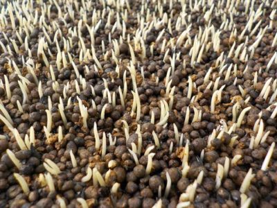 発芽器の中は真っ暗で一度も陽に当たっていないので、芽は”もやし”のように真っ白です。この白いのを鞘葉(しょうよう)と言って、この中に1枚目の葉っぱが入っています。稲はチューリップのように巻いてある葉が出てきます。