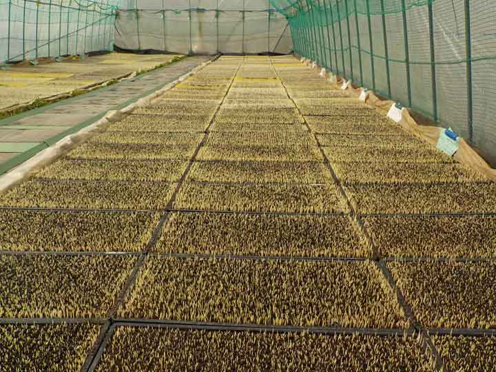 順にビニールハウスの床に並べていきます。500枚を1時間弱で並び終えました。この土が詰まった育苗箱は1箱あたり約7kgあるので、並び終える頃には腰が痛くなります。