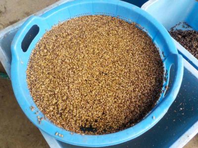 これは古代米の選別作業。塩水ではなく真水で選別です。