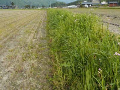 気温が高いのであぜ道の雑草も良く伸びます。田植え前に一度草刈りをしておくと田植え後の作業に余裕が出て良いと思いました。
