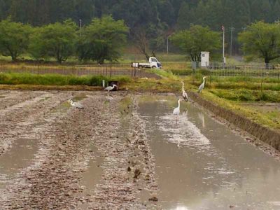 田んぼの耕起。掘り起こされたカエルを食べようとたくさんのサギが集まってきます。