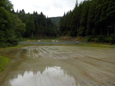 こちらはずっと前から栽培している山間部の田んぼ。田んぼの形がべごべごでイノシシの遊び場になるので、これはこれで管理がたいへんです。全国で農地が余ってきているというのはこういった手間がかかり過ぎる農地で、割に合わないからやりたくないと思うのは十分にわかります。