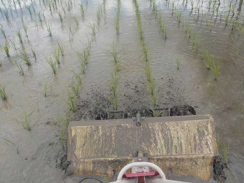 中期の除草は、チェーン除草で取り残した雑草が少し大きくなっていることもあり、中耕除草機で土の中に雑草を埋め込みます。田んぼの中を歩かないといけないのでたいへんですが、慣れてくると1時間で10aのペースで回れます。