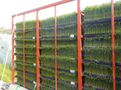 まずはトラックの荷台に苗積み。以前はこの時期の田植えだと苗が短がすぎて悩むことが多かったのですが、ここ数年は伸びすぎて悩むことの方が多いような感じです。それくらい春先の気温が高くなっているのが苗の長さを見ても実感できます。