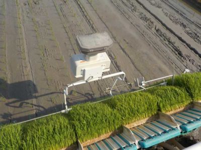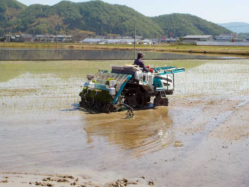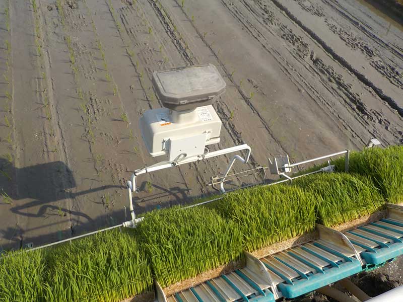 8条の田植え機で1反(10a)あたり約15分で植えていきます。田植えのコツは田植え機を出来るだけ止めないこと。田植え機には2人乗る、肥料は最初に全部乗せる、苗継ぎは最少になるように密苗を使うなど、田植え機が常に動いているようにするとスムーズに田植えが出来ます。