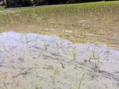 田植え直後の苗。お米が穀物として優れているのは、この1株数本の苗が20本以上に増えることです。このスカスカの田んぼも6月頃には水面が見えなくなるほどです。ちなみに同じイネ科の麦も同様に増えます。