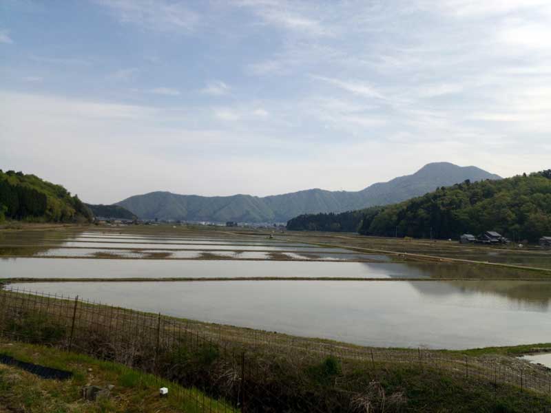 まだ水が張ってあるだけの山間の水田地帯ですが、これからどんどん田植えが始まります。1ヶ月後には田植が終わり、6月頃には緑色、8月後半には黄金色の風景が見られると思います。