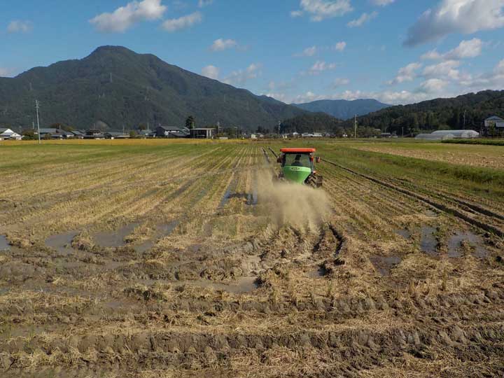 稲刈りの終わった田んぼに米ぬかや貝化石、くん炭を散布します。いわゆる”秋肥”や”秋処理”とよばれるもので、稲ワラを分解したり田んぼの微生物の栄養になったりします。