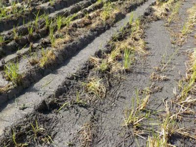 ”稲にとっての田んぼ”は私たちの胃や腸と同じで、分解しにくい稲ワラが田んぼに残ってしまうと春先にガスが湧く原因になってしまいます。食物繊維の多いサツマイモを食べるとおならが出やすくなるのと同じで、田んぼからブクブクと臭い泡がでてきます。