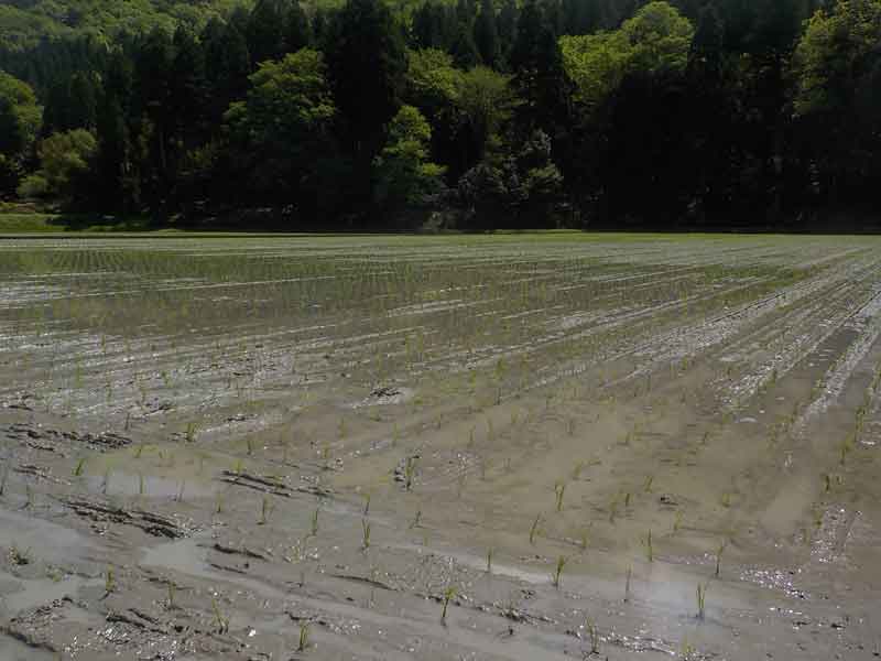 田植え後の田んぼはこんな感じでスカスカ。稲は1本の株から複数本の株に増えるので、1ヶ月もすると青々としてきます。毎年同じようなことをしていても違った結果になる農業ですが、今年はどんな栽培になるのか不安でもあり、楽しみでもあります。