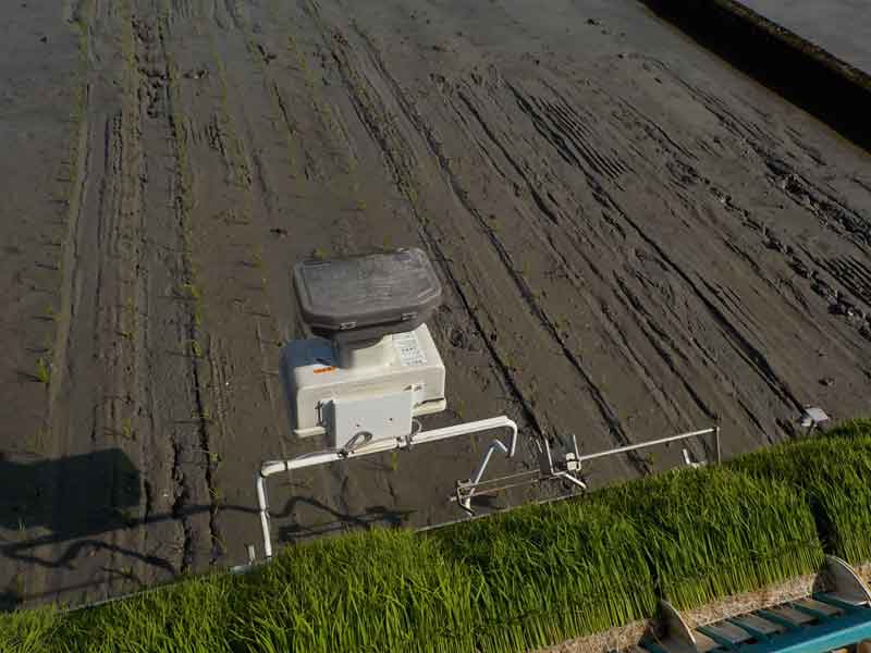 田植え開始。田植え機の後ろに乗るのも一年ぶりで、ずっと苗と肥料の補充をしています。8条の田植え機で10aあたり約15分で植えていきます。大きい川の傍の田んぼだと大き目の石がゴロゴロしているので、田植え機もかなり揺れます。田植え機は基本運転手一人乗りなので、さらにもう一人乗っていると結構落ちそうで危ないです。