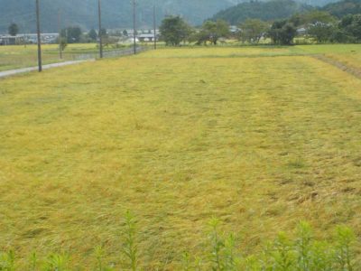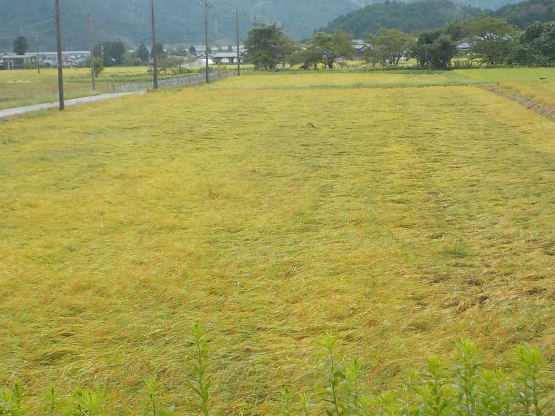 今年、印象的だったのが稲が倒伏した田んぼが多かったこと。出穂後に雨が続いたことが原因だと思うのですが、ここまで見事に倒れたのは今まで見たことが無いくらいです。地域的なもので、他の農家さんの田んぼも広範囲にわたって倒れてしまいました。