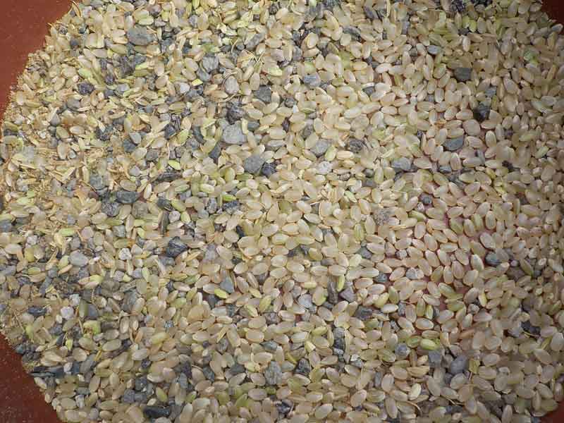 倒れた稲のお米は、まず、土と一緒に刈り上げるので小石がたくさん混じります。これは機械でほとんど除去できるのですが、