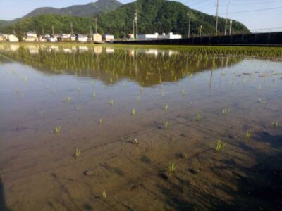 田植え後の田んぼ。1株3本ほどで植えているのでかなり弱々しいですが、稲のすごいところはこの3本が20本以上に増えること。現時点では田んぼの土面が見えていますが、穂が出る頃には全く土が見えないくらいになります。