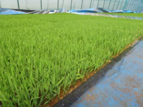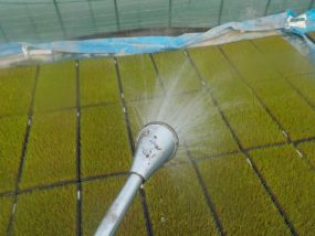 一番最初に種をまいたハナエチゼンの苗の緑化が完了したので、今後はプールに水を張って管理していきます。