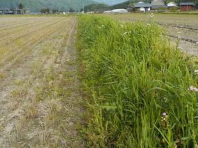 5月にもなると気温も高くなり、畦道の雑草もどんどん大きくなります。苗を植えてから雑草を刈ると田んぼに入ってしまうので、耕起前に邪魔な雑草を刈っておきます。
