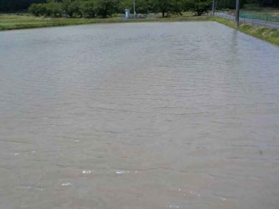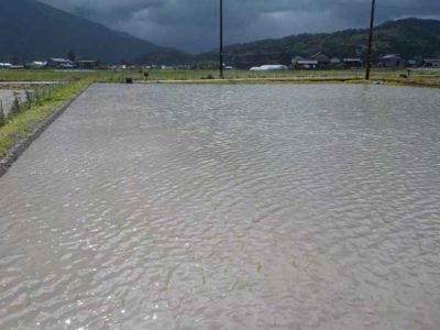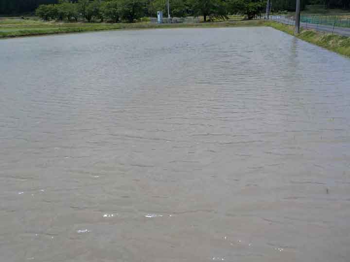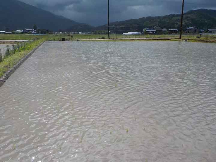 これは先週植えた無農薬栽培コシヒカリの田んぼ。無農薬の田んぼなので水がもともと濁っているのと、昨晩の大雨でほとんど苗が見えません。