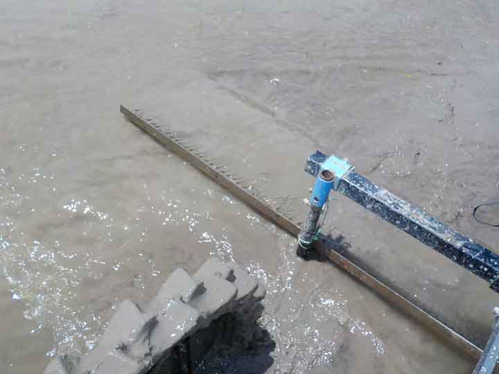 除草中はこんな感じ。これだけ水があると改造した田植え機も重そうに走っています。