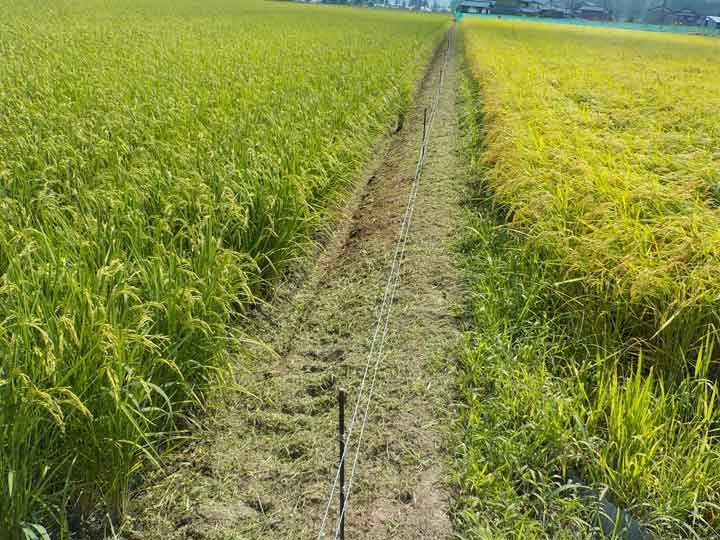 ハナエチゼンの稲刈りが終わったら次の飼料米の稲刈りまでしばらく時間があるので、またいつもの草刈りに戻ります。この時期になるとイノシシの活動が活発になるので、電気柵の下草などをこまめに刈ってやる必要があります。