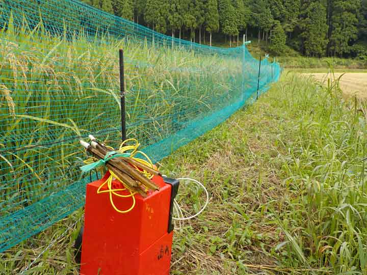 稲刈り前に、邪魔になる電気柵や防獣ネットを取り外します。イノシシが出る田んぼは、こういった害獣対策をしておかないと稲刈りができなくなるくらい酷いことになってしまいます。