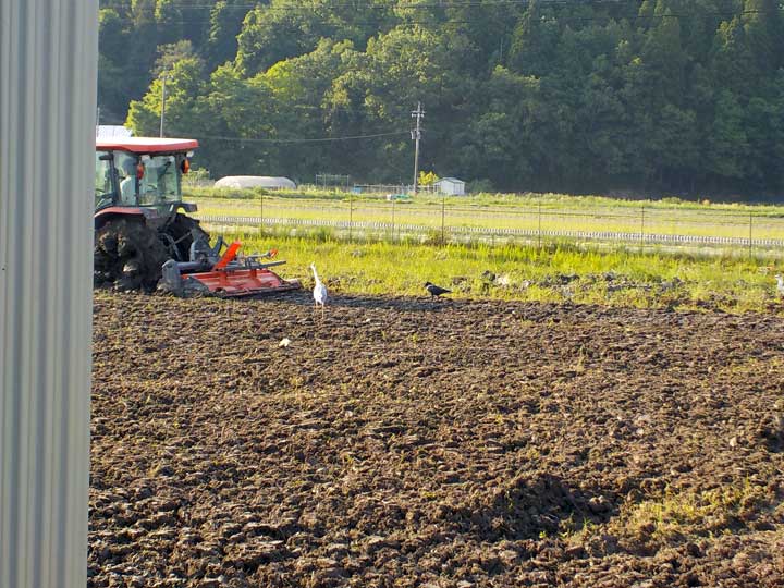 サギの真似をして土から出てくるカエルを食べようとしているところ。サギと違って足が短いので水の張ってある田んぼには入れません。
