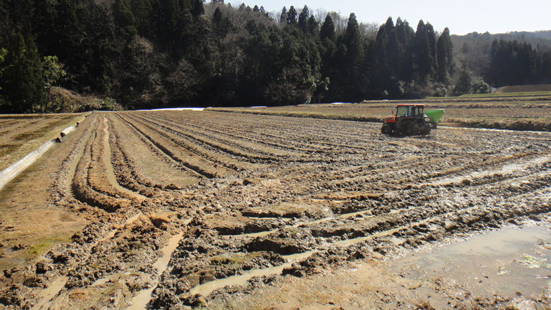雪が解けたので、田んぼの水を抜いて発酵肥料をブロードキャスターを使って散布。