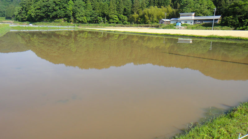その後耕起し、田植えまで水を張っておきます。発酵肥料をまいた田んぼよく濁ります。
