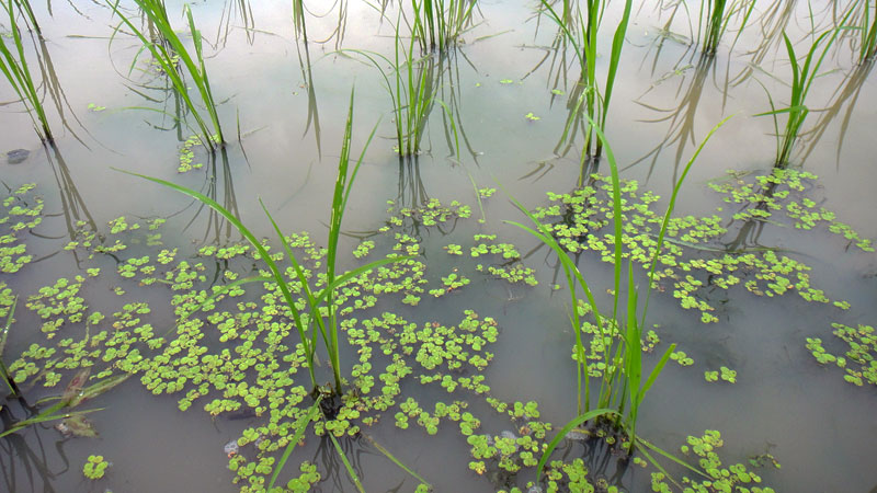 さらに数日すぎると、水が常に濁り、藻や浮草が発生します。濁り水だと、雑草は発芽しても、光があまり当たらないので大きくなりにくいみたいです。