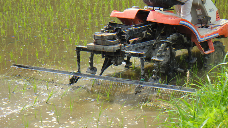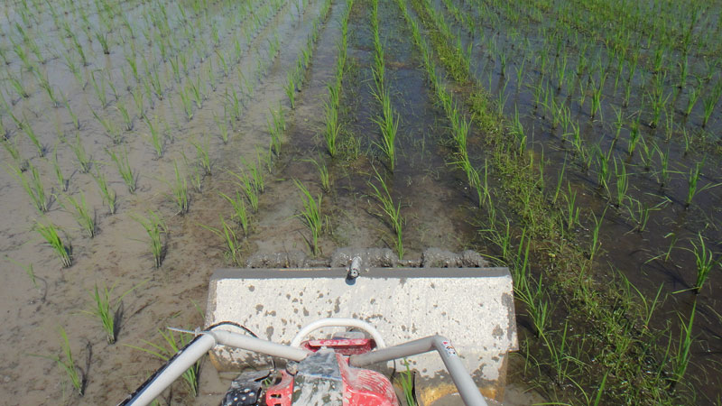 田んぼの濁り水だけでは雑草はなくならないので、生えてしまった雑草をチェーン除草機で抜きます。今年からの試みです。