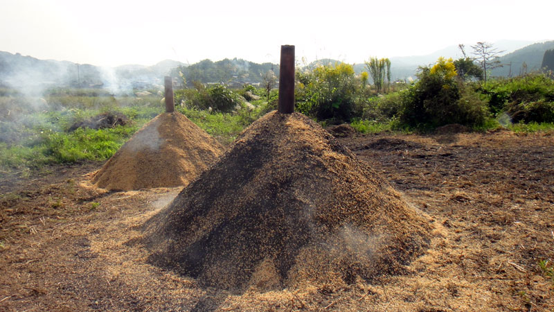稲刈り直後から次年度へ向けての作業が始まります。土づくりのためのくん炭や肥料を作ります。