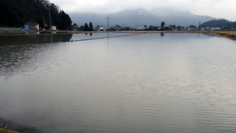 肥料散布、耕起した後は水を張って翌年の雪解けを待ちます。毎年田んぼに水を張っていても1mは雪が積もるのですが、今冬はほとんど雪が降りません。
