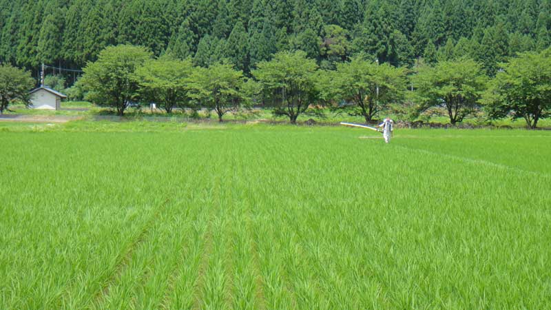 背中に20kgの肥料を入れた動力散布機を担いで100mの畦道を歩きます。何度も往復するので真夏の追肥散布は汗だくになります。