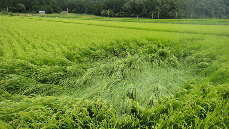 8月の台風。穂が大きすぎたり、根がしっかり張っていないと稲が倒れてしまいます。倒れた稲の穂は水に濡れて腐ってしまったり、発芽してしまったりと良いことがありません。