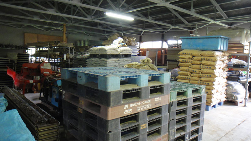 栽培で使用した肥料の残りや機械を施設の奥のほうに押し込んで、
